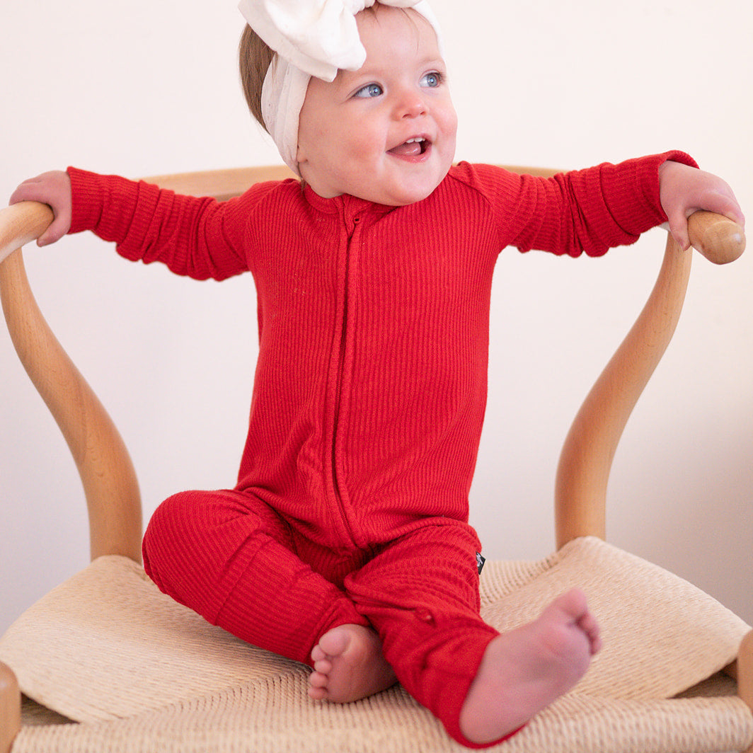 Introducing the 'Red' Ribbed Bamboo Zip Romper - the ultimate solution for all things baby loves to do, lounge, play, eat, you name it! Made with 95% Bamboo Viscose and 5% Spandex, this romper is made from a custom milled rib jersey fabric for ultimate softness and breathability. Bamboo clothing also offers temperature-regulating properties, antimicrobial qualities, and stretch for room to grow. With convenient features like double zippers for easy diaper changes, fold-over footies, and fold-over hand cuffs up to sizes 18month, this garment is designed with your child's comfort and safety in mind.Â